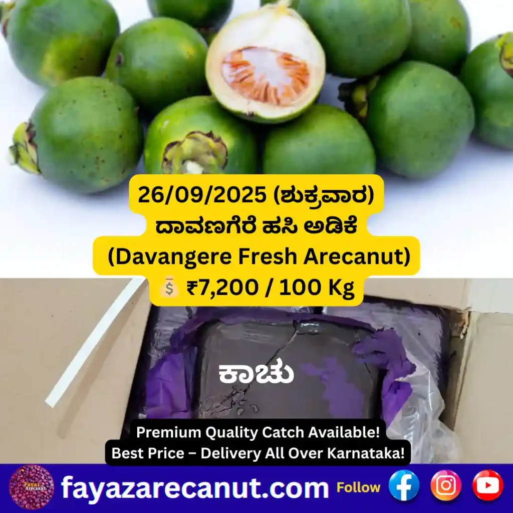 ಇಂದಿನ 26 ಸೆಪ್ಟೆಂಬರ್ 2025 – Shivamogga, Channagiri, Davangere Hasi Adike ಮತ್ತು Arsikere Copra Market ದರಗಳ ನಿಖರ ಅಪ್ಡೇಟ್. Fayaz Arecanut ನಲ್ಲಿ ಪ್ರತಿದಿನ ನಿಖರ ಹಾಗೂ ವಿಶ್ವಾಸಾರ್ಹ ಮಾರುಕಟ್ಟೆ ದರಗಳ ಮಾಹಿತಿ.