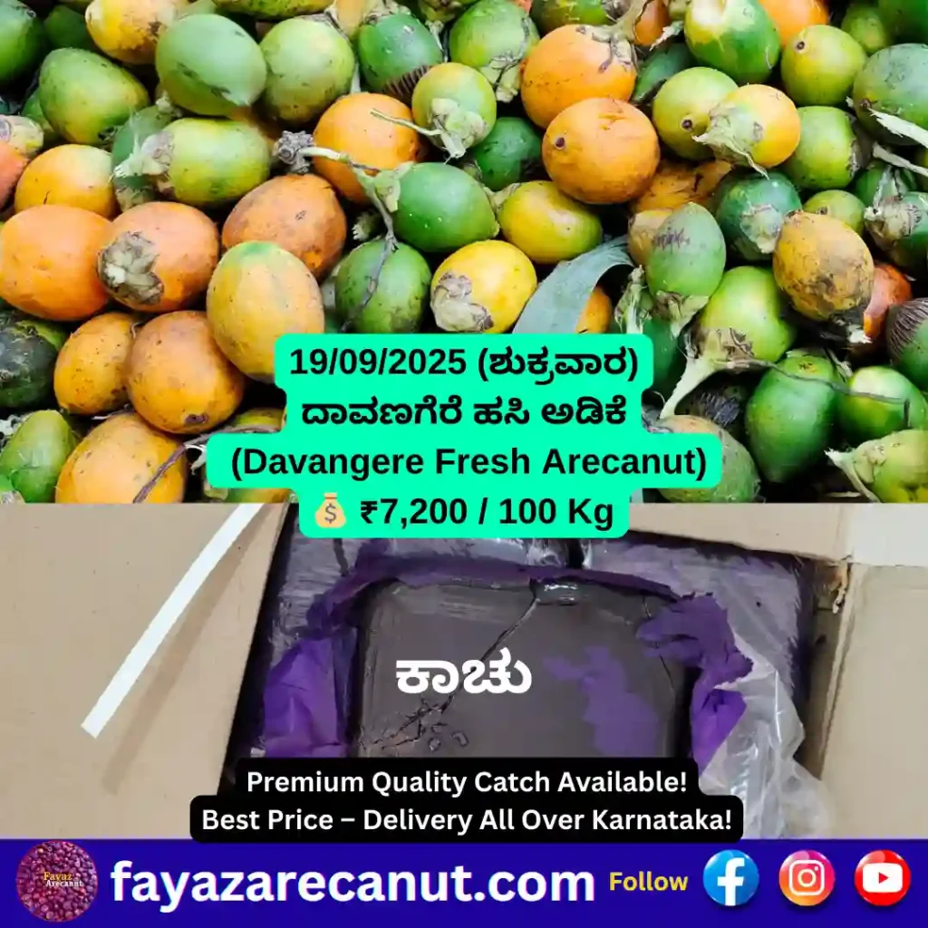 Arecanut Price Today 19 September 2025 – ಇಂದಿನ ಶಿವಮೊಗ್ಗ (Saraku, Gorabalu, Bette, Rashi, New Rashi), ಚನ್ನಗಿರಿ, ದಾವಣಗೆರೆ ಹಸಿ ಅಡಿಕೆ ಮಾರುಕಟ್ಟೆ ದರ ಹಾಗೂ ಅರಸೀಕೆರೆ ಕೊಬ್ಬರಿ (Copra) ಟೆಂಡರ್ ನವೀಕರಿಸಿದ ಬೆಲೆಗಳು. Fayaz Arecanut ನಲ್ಲಿ ಪ್ರತಿದಿನ ನಿಖರ ಹಾಗೂ ವಿಶ್ವಾಸಾರ್ಹ ಮಾರುಕಟ್ಟೆ ಮಾಹಿತಿ.
